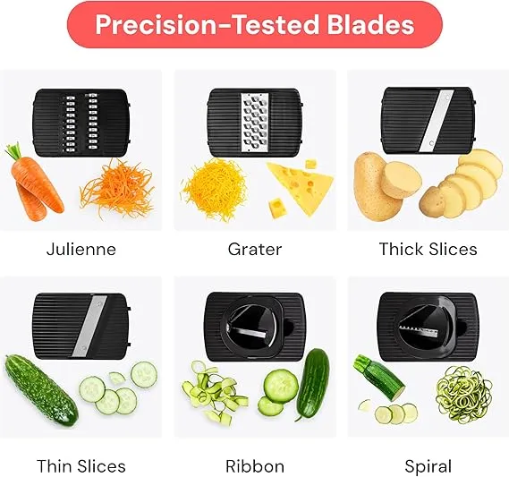 • Greatest Functionality on the Market – This 5-cup, large-capacity mandoline slicer features 6 interchangeable blades to meet all your slicing, grating, and spiralizing needs. Create zoodles, vegetable pastas, and beautiful garnishes with ease — a useful gift and one of the most versatile kitchen gadgets for healthy meal prep.