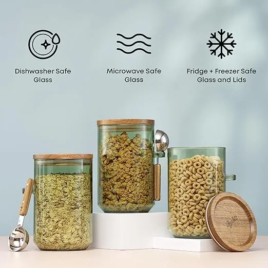 - 3 GLASS CANISTERS WITH SCOOPS: Upgrade your kitchen storage with these 32oz borosilicate glass food storage containers! Each container features a built-in handle to conveniently hold its spoon on the side, making it easy to scoop 1 tbsp of everything from morning coffee beans to evening bath salts.